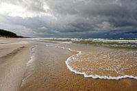 Weids uitzicht over een verlaten strandgedeelte, op de voorgrond een ondiep watergebied met een opvallend gevormde deining, daarboven deels dramatische wolken die een weersverandering aankondigen - lokatie: Poolse Oostzeekust, Slowinski Park Narodowy (Slowinski Nationaal Park)