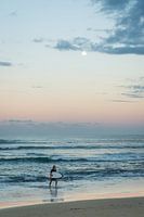 Een man komt de zee uit lopen na het surfen. Hij is al vroeg begonnen, want de maan is nog steeds zichtbaar. Mooie pastelkleuren.
