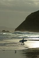 Een surfer op het strand bij St Kilda, Dunedin, Nieuw Zealand. De branding hier staat bekend om zijn hoge golven en is een waar surfers paradise. Bij zonsondergang verlaten de surfers het strand en nemen de meeuwen het stokje over. Iets verderop komt elk voorjaar een zeebeer aan land om te jongen.
