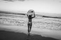 Zwart wit foto van een vrouw die de zee in loopt met haar surfplank. Op het strand van Bali, Indonesië.