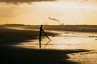 Surfer kijkt uit over zee tijdens het gouden uur in Scheveningen. Zijn silhouet is goed zichtbaar met op de achtergrond de Maasvlakte.