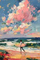Een surfer loopt over het strand met een roze surfplank, omringd door een lucht vol kleurrijke wolken. Het impressionistische werk boeit met levendige kleuren en gedetailleerde penseelstreken die beweging en licht vangen. Het harmonieuze kleurenpalet creëert een vrolijke, zomerse sfeer, terwijl de compositie de vrijheid en lichtheid van…