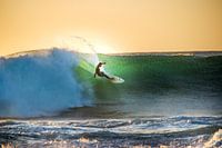 Bij zonsondergang waagt een surfer zich op de hoge golven aan de westkust van Australië. Dit is Kalbarri inWest-Australië. De ondergaande zon belicht de golven van achteren en geeft ze de kleur van transparante, intens groene kleur van jade. De lucht wordt langzaam een zachte tint van oranje en geel.