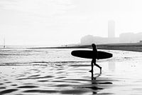 Surfing , a way of life . Een rauwe zwart-wit omzetting van de surfer op het strand van Oostende