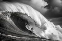 Een imposante surfer, vechtend tegen de machtige kracht van de natuur, is vastgelegd in majestueuze zwart-wit tinten. De dynamische golven lijken tot leven te komen, terwijl de dramatische achtergrond van wolken een koele, energieke sfeer creëert. Ideaal voor een moderne woonkamer die een gevoel van avontuur en de oceaan naar je eigen…