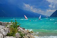 Surfers in Riva aan het Gardameer bij stormachtig weer. Zwanenfamilie in de golven