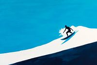 Een krachtig moment van adrenaline, vastgelegd in levendige tinten blauw en wit. Een surfer beheerst de golf terwijl het opspattende water dynamisch flitst. Deze minimalistische afbeelding straalt energie en vrijheid uit en zou perfect passen in een moderne woonkamer of creatief kantoor aan huis om inspiratie en de geest van avontuur aan te moedigen.