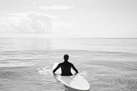 Het kalme wateroppervlak weerspiegelt zachte wolken, terwijl een eenzame figuur op zijn surfplank de oneindige vrijheid in zich opneemt. Omgeven door glinsterend grijs straalt de aanblik een melancholische sereniteit uit, alsof de tijd heeft stilgestaan. Een moment van stilte voordat de golven de moed van de surfer op de proef stellen.