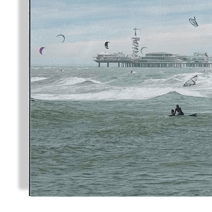 "Surfers Paradise" is een prachtige fotografische afbeelding van het strand van Scheveningen, waar kite- en windsurfers te zien zijn tijdens een winderige dag. De boulevard en de pier van Scheveningen zijn duidelijk zichtbaar in de achtergrond, wat een gevoel van locatie en context geeft aan de foto. Kitesurfen is erg populair in…