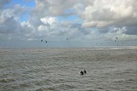 Aan het Noordzee strand kun je ze allemaal vinden, kitesurfers, windsurfers en planksurfers de laatste wachten op een golf om vanaf te glijden. de vele vliegers verraden de kitesurfers en daar tussen de kleurige zeilen van de windsurfers.