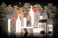 Heerlijk surfen in de zonnige warme tropen. Het is middernacht en volle maan. Het maanlicht schijnt op de gestucte witte buitenmuren van de hutten. De hutten liggen in de schaduw van hoge palmbomen en andere exotische bomen. Er staan twee surfplanken in het rek dat is bevestigd aan de achtermuur van een van de hutten. De andere surfplanken liggen aan de voorkant van het surfkamp, in een cirkel om de vlaggenmast.