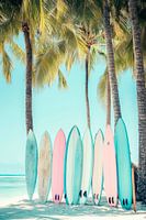 Tropische flair omringt de zachte pastelkleuren van de surfplanken, die op een rij staan op het zachte zand als een vriendelijke uitnodiging om op de golven te rijden. Hoge palmbomen werpen speelse schaduwen, terwijl de lucht intens blauw is. Hier pulseert de verwachting van avontuur met het geluid van de zee.