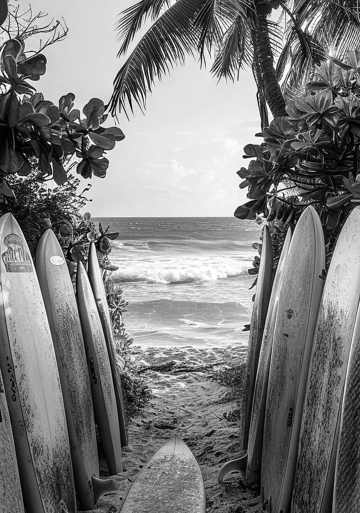 Zwart-witfoto van surfplanken tegen weelderig groen op een tropisch strand.