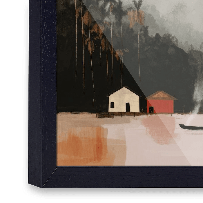 Dit sfeervolle kunstwerk vangt de serene schoonheid van het Surinaamse rivierleven. De kleurrijke huisjes aan de waterkant, omringd door wuivende palmbomen en zachte nevel boven het regenwoud, ademen rust en authenticiteit uit. Op de rivier glijden traditionele boten voorbij, een subtiele verwijzing naar het dagelijkse leven dat hier in…