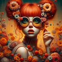 Portret van een meisje met rood haar en een grote bril, dit kleurrijke portret heeft bloemen in vele kleuren, geel, rood, blauw, roze, paars. Het maakt het een vrolijk en kleurrijk geheel, doordat de bloemen overal zijn, maakt het het geheel wat surrealistisch, maar zeker bijzonder om naar te kijken. Door de gele achtergrond wordt het…