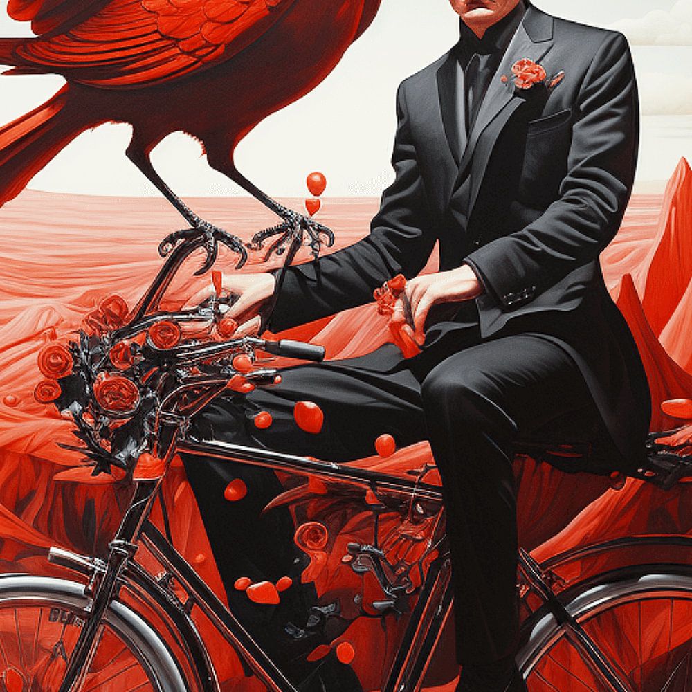 Dit opvallende kunstwerk toont een surrealistische scène in een prachtig, monochroom rood landschap. In het midden zit een keurig geklede man in een zwart pak en een zonnebril op een klassieke fiets. Een enorme, felrode vogel met uitgestrekte vleugels zit op zijn stuur en kijkt voor zich uit. Het landschap wordt gekenmerkt door organische, golvende rode formaties en puntige, koraalachtige structuren rijzen op in de achtergrond. Rode rozenblaadjes liggen verspreid op de grond en sieren de motorfiets, wat het tafereel een romantische, maar mysterieuze en licht griezelige sfeer geeft. De wolken in de lucht zijn in zachte grijstinten en rood, wat bijdraagt aan de surrealistische esthetiek.