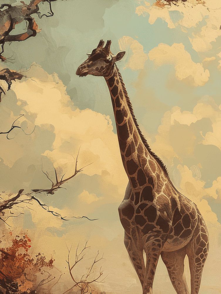 Een Giraffe in een surrealistisch landschap die rustig aan komt lopen. Mooi en zacht oranje en blauw.