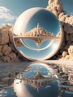 Een prachtig surrealistisch minimalistisch landschap, een andere wereld waarin de elementen glas, metaal, lucht en water voorkomen. Het kunstwerk dat je aandacht trekt. Het voelt als een droom van de futuristische toekomst. Je blijft ernaar kijken en zoeken naar herkenning, maar die is er niet. Dit is een andere wereld. De
