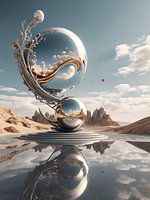 Een prachtig surrealistisch minimalistisch landschap, een andere wereld waarin de elementen glas, metaal, lucht en water voorkomen. Het kunstwerk dat je aandacht trekt. Het voelt als een droom van de futuristische toekomst. Je blijft ernaar kijken en zoeken naar herkenning, maar die is er niet. Dit is een andere wereld.