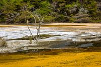 Waimangu Volcanic Valley is een geothermisch gebied in de buurt van Rotorua. Dit is de grootste warmwaterbron ter wereld. Het Frying Pan Lake. Je ziet het borrelen en stomen.