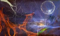 Surrealistisch landschap, blikseminslag. Donder, bliksem en vuur. Apocalyps. Digitale kunst.