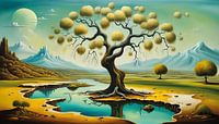 Een surrealistich landschap in de stijl van Salvador Dali met dominerend een boom met maretak-achtige bollen.