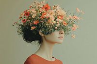 Dit unieke kunstwerk toont een surrealistisch portret van een vrouw met een extravagante bos bloemen die haar gezicht gedeeltelijk bedekt. De mix van zachte pasteltinten en levendige oranjerode bloemen creëert een dromerige en poëtische sfeer. Het ontwerp straalt een combinatie van rust en natuur uit, perfect voor wie houdt van een moderne, artistieke touch in hun interieur. Het is een opvallend kunstwerk dat de natuurlijke schoonheid van bloemen en de subtiliteit van portretten op een verfrissende manier samenbrengt. Een prachtige toevoeging aan een slaapkamer of eetkamer, dit werk trekt direct de aandacht en geeft een ruimte een unieke uitstraling.