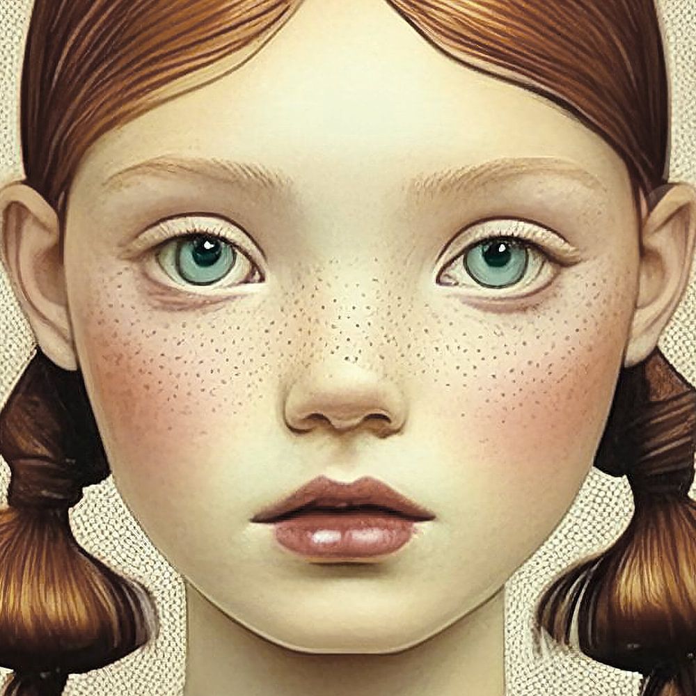 In een droomachtige scène zit een vrouw met delicate gelaatstrekken en een mysterieuze glimlach. Haar ogen stralen een diepe, ondoorgrondelijke wijsheid uit, alsof ze geheimen kent uit een andere dimensie. Kleurrijke vlinders zweven rond haar hoofd en schouders en stromen uit haar als gedachten of dromen. Sommige lijken op haar huid te rusten en versmelten bijna met haar, alsof ze deel uitmaken van haar wezen. De lucht om haar heen trilt lichtjes, alsof het fladderen van de vleugels van de vlinders de grenzen tussen werkelijkheid en fantasie opheft.