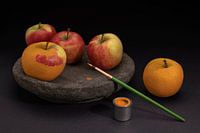 Creatief surrealistisch stilleven van appels en sinaasappels op een stenen schaal met penseel en verf