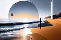 Dit werk uit mijn serie "Strand en zee surrealistisch" combineert de visuele kracht van het kustlandschap met de precisie van geometrische vormen om een droomachtige compositie te creëren. Het gouden zandstrand en de zachte golven van de zee vormen de natuurlijke basis, met daaroverheen een enorme, semi-transparante cirkel die eruitziet als een venster naar een andere dimensie. Een kleine zwarte cirkel daarbinnen doet denken aan een hemellichaam, terwijl een witte monoliet en een smalle zwarte paal de scène uitbreiden naar het futuristische.