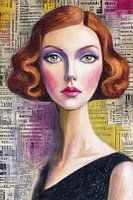 Een modern surrealistisch portret van een vrouw met koperrood golvend haar en opvallende groene ogen. De paarse oogschaduw en roze lippen geven het werk een expressieve, dromerige uitstraling. De achtergrond met collage-achtige krantendruk en kleurvlakken in geel en paars voegt een eigentijdse, kunstzinnige gelaagdheid toe. Dit schilderachtige werk ademt fine-art en past perfect in een stijlvol en creatief interieur.