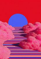 Dit kunstwerk toont een minimalistische compositie van roze wolken op een rode achtergrond met een blauwe cirkel en witte strepen die een illusionistische diepte creëren. Zwevende trappen en abstracte wolkenvormen creëren een surrealistisch, mysterieus tafereel. De heldere, contrasterende kleuren versterken het visuele effect en creëren een speelse maar harmonieuze compositie. Heldere vormen, gedurfde kleuren en de combinatie van minimalisme en surrealistische elementen creëren een opvallend, modern kunstwerk dat fantasie, diepte en visuele opwinding uitstraalt.