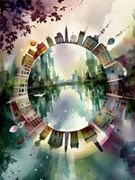 Dit kunstwerk vangt een surrealistische wereld waarin architectuur, natuur en abstractie samenkomen in een circulaire compositie. De afbeelding toont een stad die rondom een spiegelende wateroppervlakte lijkt te draaien, met gebouwen die boven en onder worden weerspiegeld. De zachte, aquarelachtige kleuren en vloeiende vormen geven het…