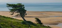 Compleet verwaaide boom in de rand van de kliffen bij het plaatsje Carteret in Normandië, Frankrijk. Mooi strand op de achtergrond zorgt voor een soort surrealisme.