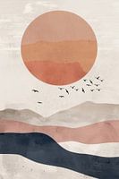 Deze moderne afbeelding van een zonsondergang boven surrealistische duinen combineert minimalistische kunst met surrealistische werelden. De zachte kleuren en elegante lijnen van het woestijnlandschap creëren een rustgevende en inspirerende sfeer, terwijl de vliegende vogels dynamiek toevoegen. Perfect voor woonruimtes die op zoek zijn…
