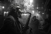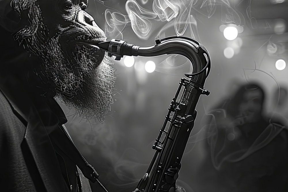 Een aap is afgebeeld als saxofonist in een sfeervolle, rokerige jazzclub, omringd door luisteraars.