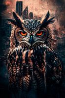 Laat je meevoeren door de mysterieuze sfeer van dit ontwerp. Een imposante uil met intense, vurige ogen domineert de compositie, terwijl een stedelijke skyline op de achtergrond subtiel zijn plek inneemt. De mix van warme en koele tinten zorgt voor een fascinerend contrast en maakt dit kunstwerk een echte blikvanger. Perfect voor liefhebbers van surrealistische kunst en dierenliefhebbers. Of het nu in een woonkamer, kantoor of creatieve ruimte wordt opgehangen, dit unieke stuk voegt een vleugje mystiek en moderniteit toe aan elke omgeving. Het ontwerp nodigt uit tot interpretatie en bewondering, waardoor het een prachtige aanvulling is op elke kunstcollectie.