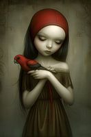 Het schilderij toont een meisje met een rode hoofdband dat teder een papegaai vasthoudt. Het tafereel ademt een sprookjesachtige sfeer uit, met pastelkleuren en surrealistische elementen. Het meisje en de papegaai lijken een mysterieuze band te hebben, die tot uitdrukking komt in hun liefdevolle omhelzing en intense oogcontact. De scène…
