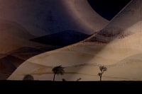 Een surrealistisch schilderij in de woestijn als een spannend landschapsschilderij in zandbeige kleuren.