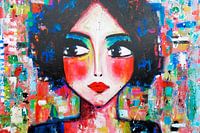 De vrouw op het doek kijkt dromerig opzij, haar grote ogen vol nieuwsgierigheid en verlangen. Haar zwarte haren knallen als een explosie van passie tegen een achtergrond die bruist van het leven. De kleurrijke chaos eromheen lijkt op het eerste gezicht willekeurig, maar wie langer kijkt, ontdekt ritme, harmonie en beweging.