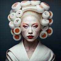 Fantasie portret van een albino vrouw met sushi kapsel.