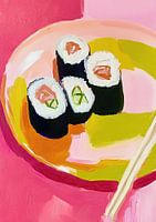 Een eenvoudig olieverfschilderij van sushi op een roze bord, met eenvoudige vormen en lijnen, in een minimalistische, schattige stijl. Het schilderij is gemaakt in gouache, met dikke, smalle penseelstreken, zichtbare textuur en een zware impastostijl. Het kleurenpalet is gedurfd en pastel, met weinig contrast. De foto is genomen vanuit een lage hoek en de afbeelding heeft een hoge resolutie, hoge scherpte en een hoog detailniveau. De achtergrond is vlak en heeft geen schaduwen.