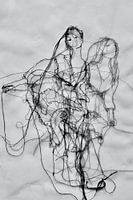 Een dubbellaags draadwerk op transparante stoffen, twee figureren vormen samen één.