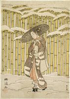 Suzuki Harunobu (1725 - 1770) was een vooraanstaande 18e eeuwse Japanse houtsnijkunstenaar die bekend staat om zijn belangrijke bijdragen aan de ukiyo-e kunst. Hij wordt vaak beschouwd als een van de pioniers van de kleurrijke houtsnede. Harunobu onderscheidde zich door zijn delicate en elegante afbeeldingen van schoonheden, alledaagse taferelen en natuurmotieven. Hij speelde een belangrijke rol in de ontwikkeling van de ukiyo-e stijl en hielp bij het perfectioneren van de technieken van meerkleurendruk. Harunobu's werken weerspiegelen de verfijnde esthetiek en het culturele leven van de late Edo-periode in Japan en zijn nu zeer gewaardeerde kunstwerken die zijn artistieke gevoeligheid en vaardigheid laten zien.