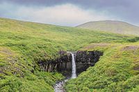 De beroemde Svartifoss waterval in Skaftefell, IJsland. Svartifoss (vertaald als "Zwarte Waterval") is een van de meest iconische watervallen in IJsland, meer bekend om zijn opvallende omgeving dan om zijn grootte. Achter de waterval creëren zeshoekige basaltzuilen een uniek en dramatisch amfitheater. Aan deze donkere lavakolommen dankt de waterval zijn naam. Ze zijn ontstaan door de langzame afkoeling van lava, waardoor het gesteente kristalliseert en breekt in deze geometrische vormen.