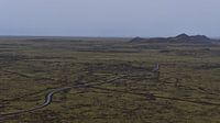 Luchtfoto van een enorm lavaveld op het schiereiland Reykjanes in het westen van IJsland, reikend tot aan de horizon en doorkruist door een kronkelige weg en een rode pijpleiding.... Het kale landschap van zwarte lavarotsen bedekt met groene mossen doet zijn naam eer aan - Svartsengi betekent zwarte weide in het IJslands.