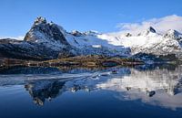 Een bootje vaart voorbij op de door besneeuwde bergen omsloten Husvågen-fjord nabij Svolvær, op de Lofoten in het noorden van Noorwegen.