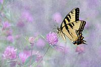 Mooie geel zwarte swallowtail vlinder op een klaverbloem in pastelkleuren