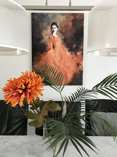 Abstract impressionistisch fantasie portret van een dansende Aziatische vrouw. Mixed media in bruin en oranje tinten met grove penseelstreken op canvas.