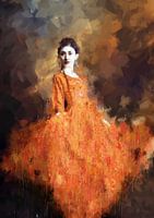 Abstract impressionistisch fantasie portret van een dansende Aziatische vrouw. Mixed media in bruin en oranje tinten met grove penseelstreken op canvas.